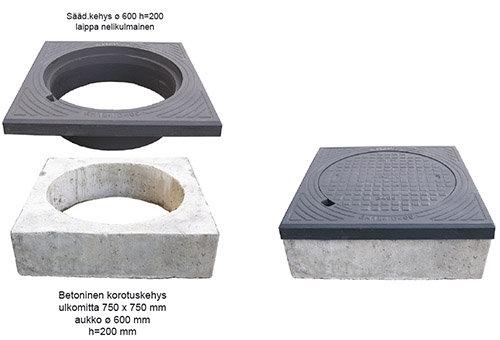 Betoninen korotuskehys 750x750 h=200 mm | 3323851 | 221,00 | Tarkoitettu säädettävälle kehyselle ø 600 h=200 mm Laippa nelikulmainen |