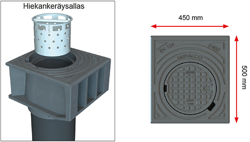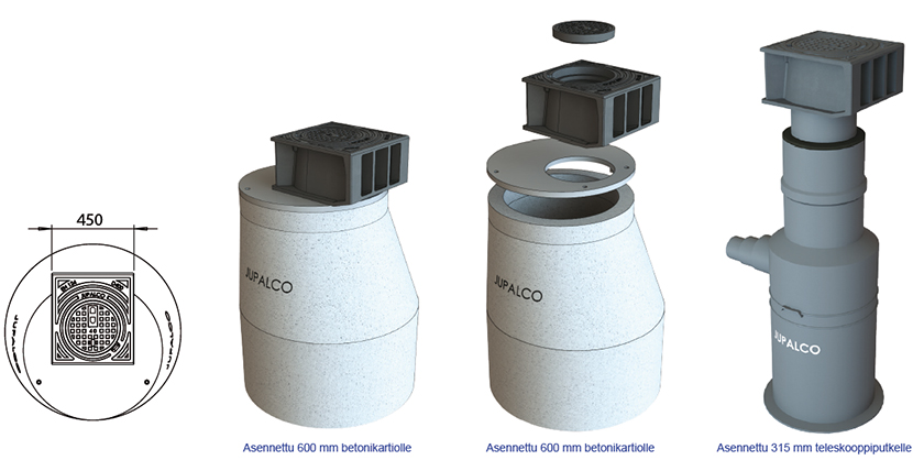 Jupalco kitakansisto 450 x 500 mm on yhteensopiva 315 mm:n muoviputkeen. Kansistoa voidaan käyttää betonikartiosovelluksessa oheisen kuvasarjan mukaisesti (vaatii asennuslevyn).
