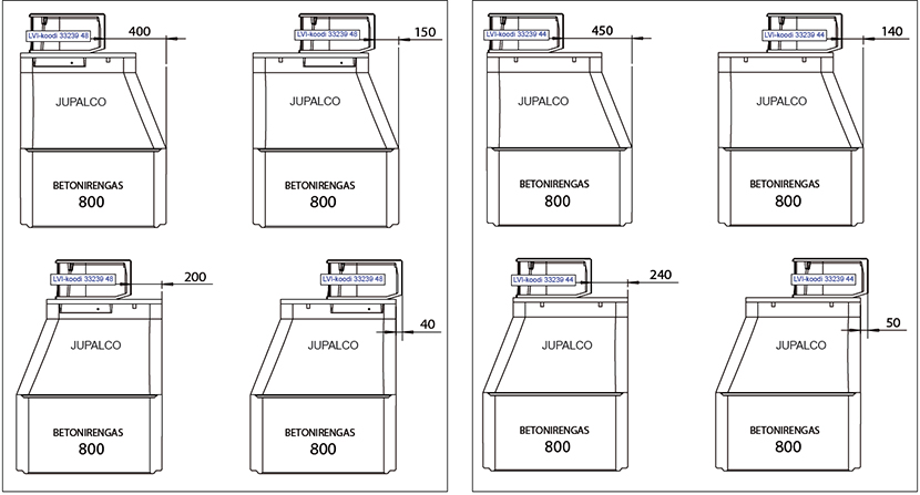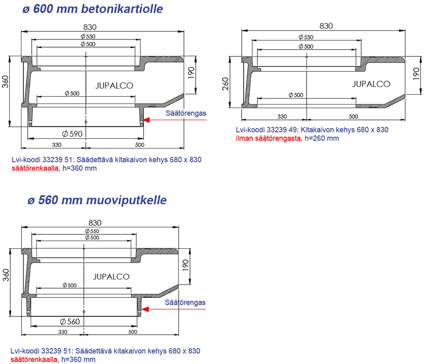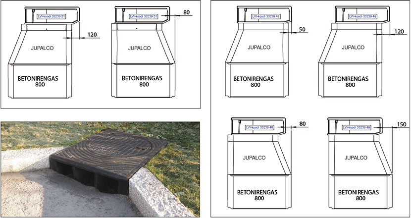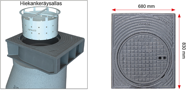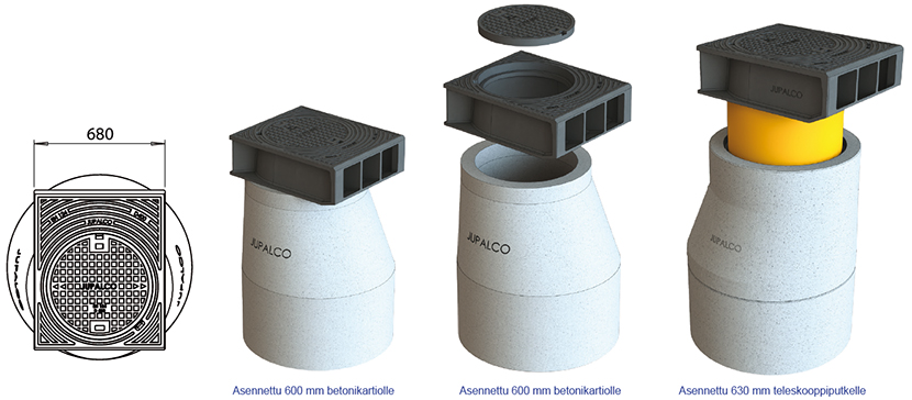 Jupalco kitakansisto 680 x 830 mm on yhteensopiva 600 mm:n betonirenkaaseen. Kansistoa voidaan käyttää betonikartiosovelluksessa oheisen kuvasarjan mukaisesti.