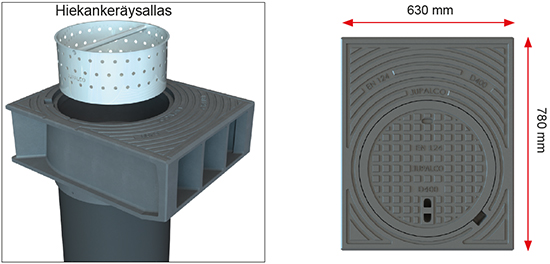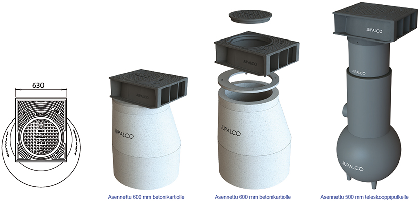 Jupalco kitakansisto 630 x 780 mm on yhteensopiva 500 mm:n muoviputkeen. Kansistoa voidaan käyttää betonikartiosovelluksessa oheisen kuvasarjan mukaisesti (vaatii asennuslevyn).