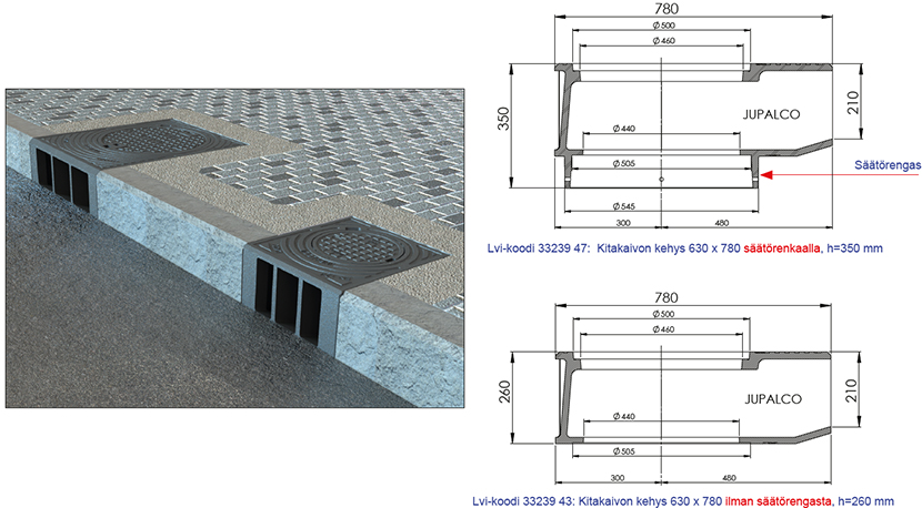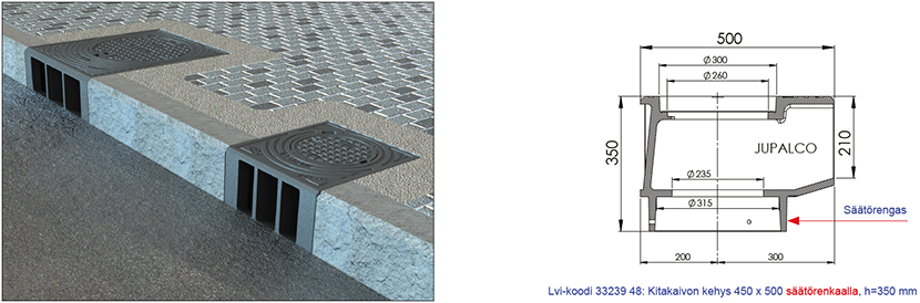 Säätörengas ø 600 mm betonikartiorenkaalle tai ø 630 mm tai ø 560 mm muoviputkelle on integroitu kitakehyksen rakenteeseen. Huomaa viistonielu, joka auttaa veden virtausta ja puhdistaa kidan hiekasta.