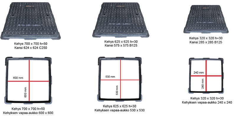 Kehys 625 x 625 h=30 mm Kansi 575 x 575 | B125 (15tn) | 3332957 | | Kehyksen ulkolaipan koko 625 x 625 mm. Vapaa-aukko: 530 x 530 mm Kansiston kokonaiskorkeus 30 mm |