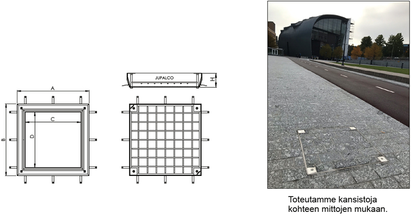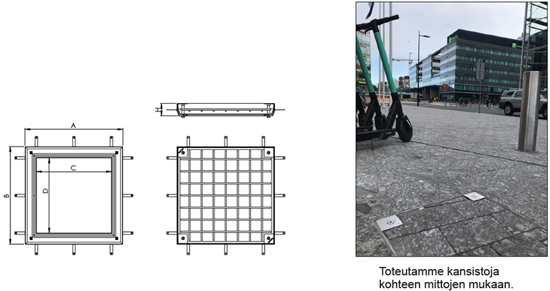 Kansistot voidaan päällystää asennuspaikan mukaan esim. laatoilla, mosaiikilla tai sävytetyllä betonilla. Kehyksestä ja kannesta jää näkyviin vain ohuet reunat sekä nostopisteet. Kehys ja kansi toimitetaan aina settinä.