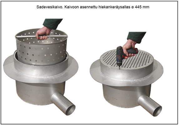 Sadevesikansi kiinnitetään rännikaivoon neljällä haponkestävällä ruuvilla.