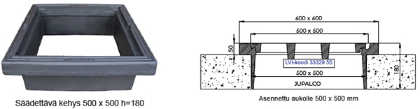 | Sääd.kehys 500 x 500 h=180 mm | 3332955 | | laipan koko 600 x 600 aukolle 500 x 500 |