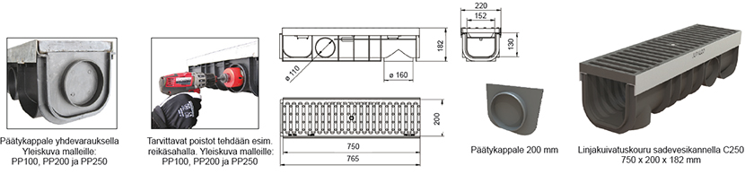 Linjakuivatuskouru PP200 Sadevesikannella C250 Poistoyhdevaraus 110 ja 160 mm | 750 x 200 x 182 | C250 (25tn) | 3366601 | |